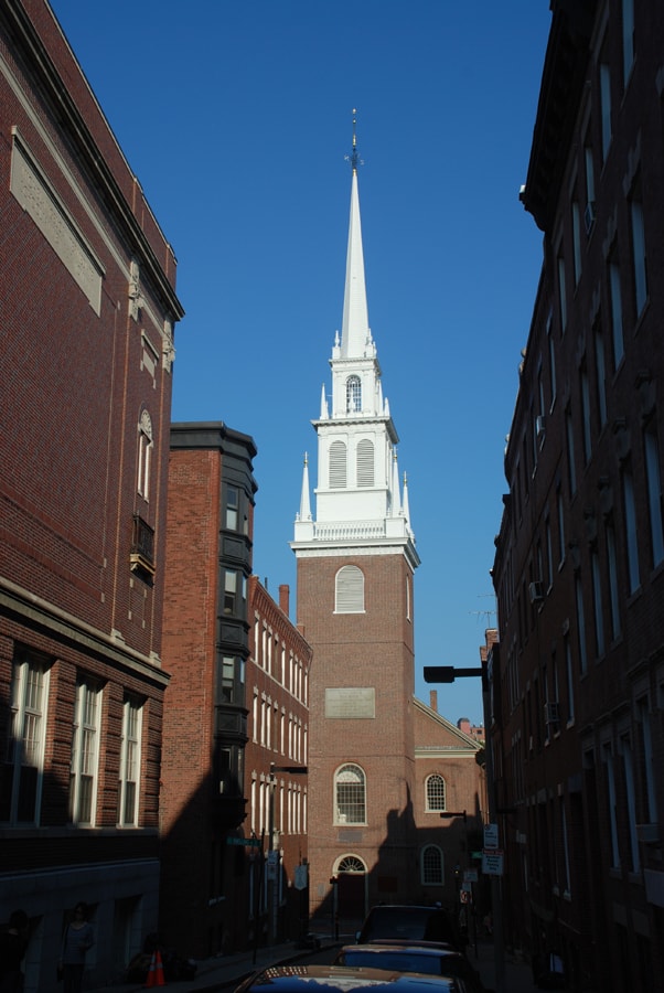 Head due north to King’s Chapel, opened in 1749, where English Puritan settlers of Boston spent hours listening to ministers preach hellfire and damnation for their souls if they did not lead a life devoted to God. Many of them are buried in another adjacent burial ground. There is a low sill at the entrance to the chapel. The burying ground has a 7-inch lip at the entrance. The paths in the burying ground are manageable but uneven.