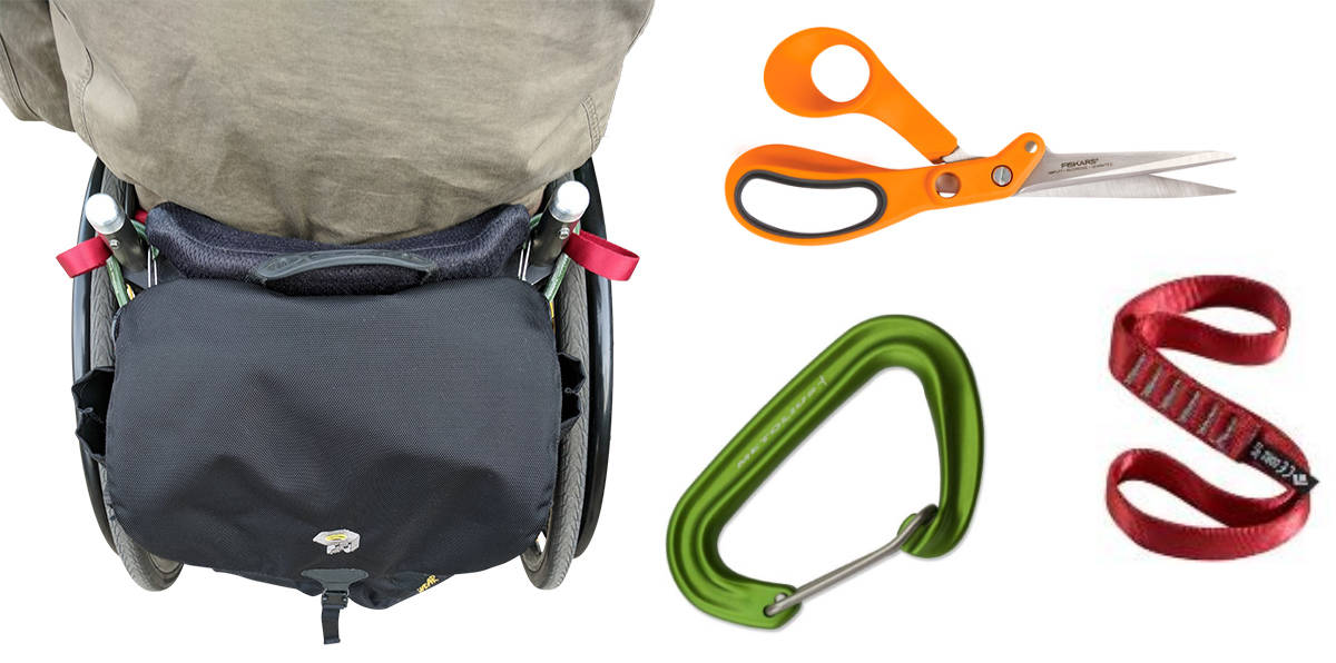 Basic requirements are that it has multiple pockets and will hang under the seat of my everyday chair without clanking around or having parts that want to feather my spokes. The it fashion accessory of the ’80s, the fanny pack, tends to fit the bill here. Fortunately, fanny packs (“lumbar packs” in today’s marketing terms) have come a long way in the past 30 years. I bought a Mountain Smith Drift lumbar pack made of durable, Cordura nylon for $50 that has two good-sized compartments with internal organization pockets and zipper pulls already attached. Also, a lifetime warranty. Try finding that on a wheelchair bag.