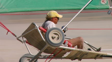 Paul Speight, 53, from Denver, Colo., owner of Spokes ‘n Motion, is a BloKart dealer. Speight, a T5-6 para for 33 years, is an avid BloKart sailor. “All you need is an open space, a bit of wind, and you are set for an afternoon of fun,” he says. BloKarts come with hand steering, so no modification is required — just unpack, strap in and ride the wind. New BloKarts go for $2,700.