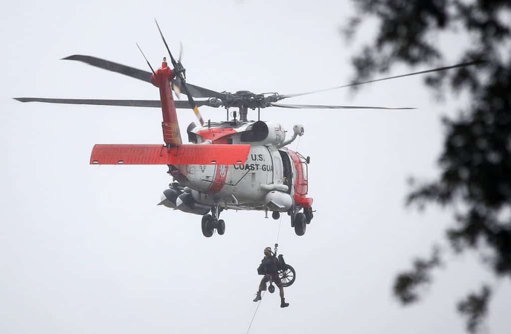 The most dramatic rescue of a wheelchair user is probably the one seen in the widely-spread image of a Coast Guardsman hoisting up a wheelchair into a helicopter, where its owner is already on board.