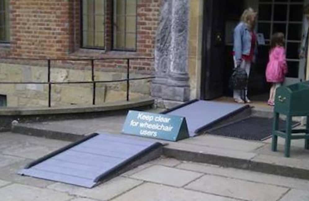 Tim Vermande set off resounding rounds of “doh!” when he posted this head-scratcher to his Facebook page on Aug. 27. Vermande, a communications specialist for disability concerns within the Methodist church, found the photo while looking for portable ramp set-up ideas, and was able to track it back to the blog, disabledaccessdenied.wordpress.com.