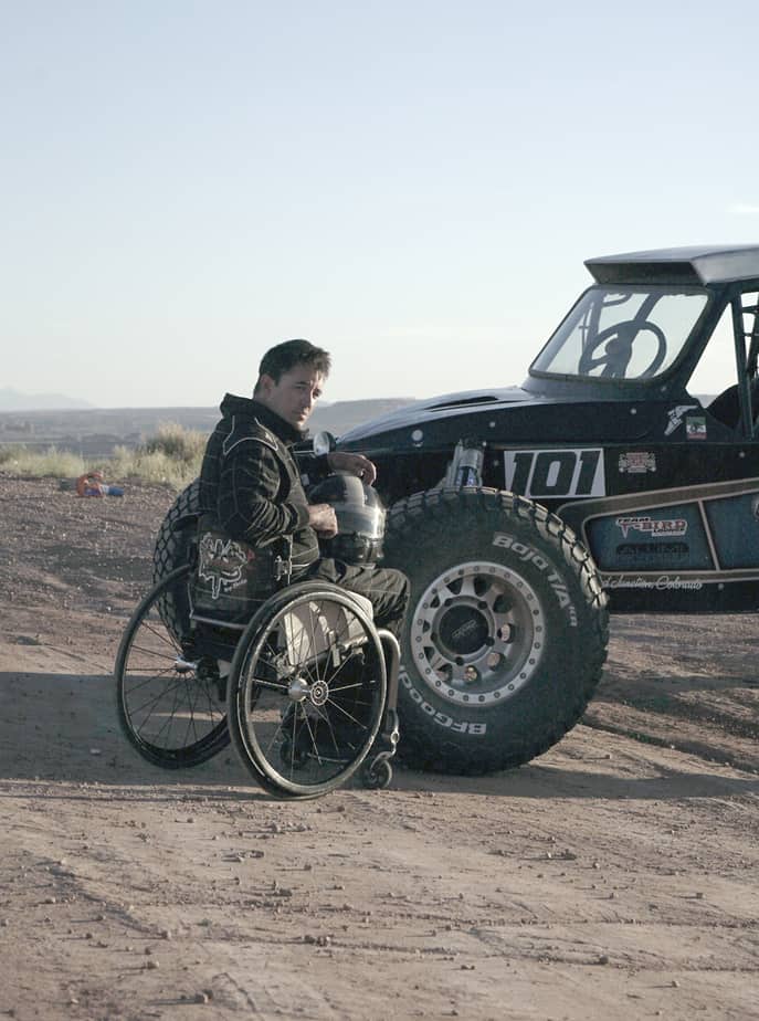 Andy Blood didn’t know he loved driving 900 horsepower trophy trucks at speeds over 100 miles per hour in off-road desert races until he started a nonprofit to help get other people with disabilities back on the road. In 2012, eight years after becoming a T12 paraplegic, Blood and his wife started Blood Brothers Foundation, a nonprofit organization to fund adaptive vehicle modifications for those who needed them (see Giving Back, bottom).