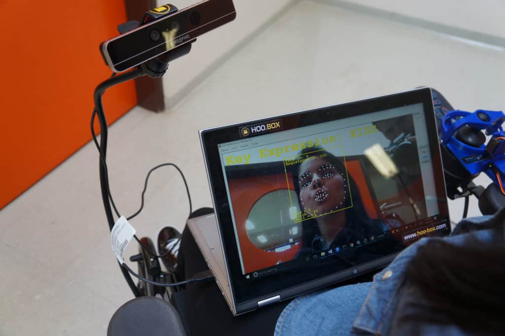 Designed for those who don’t have the hand or arm function to operate a joystick, users can choose from nine different facial expressions to drive the chair. According to the Hoobox website, “Most people prefer to use the kissy face to drive forward, a half smile to turn right, tongue out to drive backward, a wrinkled nose to turn left, and a full smile to stop the wheelchair.”