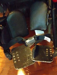 When I arrived in California my left leg rest would not connect to my wheelchair because a big piece that holds it on had broken off in transit. At that point, it was late at night and all I wanted to do was pick up the wheelchair rental van so I could go to the hotel and go to bed! So we quickly figured out a makeshift solution and with the assistance of a stewardess, used a seat belt extender to wrap my footrests together. I used that for the rest of the trip.