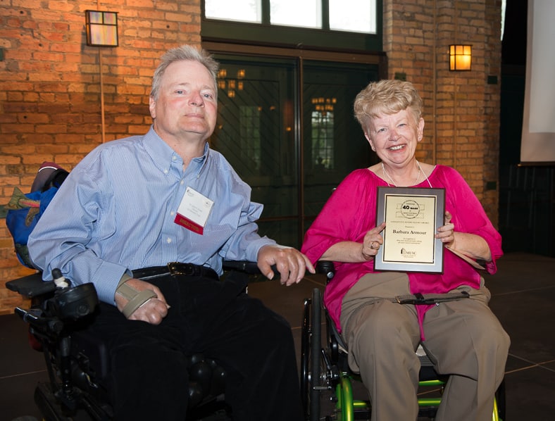 Former president of the National SCI Association, John Schatzlein, received the Career Contributions Award, much to the delight of the attendees, many of whom he had known for nearly 50 years and for whom he has served as a peer mentor. Barbara Armour was presented with the Longevity after Injury Award, having reached 58 years since the onset of her SCI. Other awards included: Community Contributor Award to Margo Imdieke Cross, who has spent countless hours advocating for accessible environments in Minnesota; Staff Lifetime Contributor Award presented posthumously to Sarah Lottes, who had a tireless commitment to SCI and who literally worked with the research team until the day she died in February at age 72. Laurel Cibick accepted a plaque of appreciation on behalf of her mother, Dr. Nancy Crewe, who initiated the study.