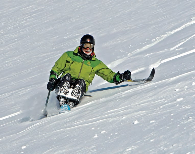 Realizing his mistake, he stopped on a very steep section just before a big cliff. “I said to myself, ‘Brad, you blew it!’ What am I going to do now? I can’t just hike up the hill!” On his radio he heard, “Brad, where are you? Are you OK?” The hill was so steep he had to keep his outriggers in the snow for balance and couldn’t reach the radio to respond. After what seemed like a long time, Jeff skied down to Parks and radioed for Jeremy to ski down and help. They tied a safety rope to Parks and spent close to an hour pulling him up to an area where he could ski across to the designated run. “The event really humbled me,” says Parks. “I realized this is the real deal and I couldn’t afford to make a mistake like that again.”