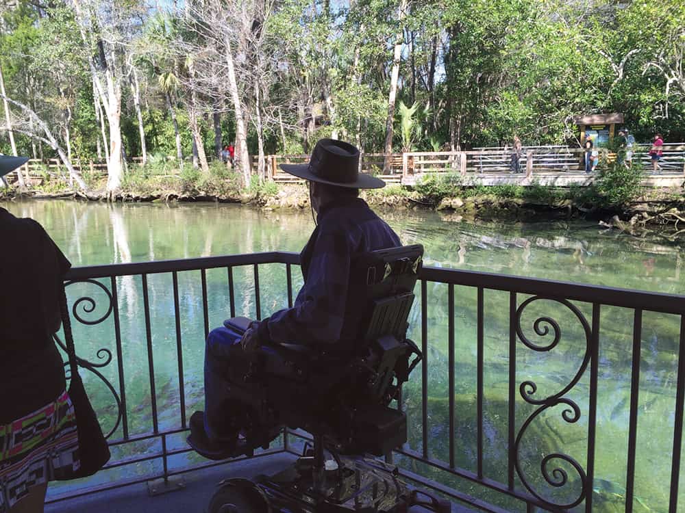 Our visit to Florida Gulf Coast’s Homosassa Springs Wildlife State Park began with a pontoon boat tour along Pepper Creek, a calm canal-like waterway surrounded by vegetation and wildlife. I rolled onto the pontoon boat via a gently sloping dock-ramp lowered upon the deck near the bow of the boat where there is plenty of flat deck for two power chairs, possibly three, or four manual wheelchairs.