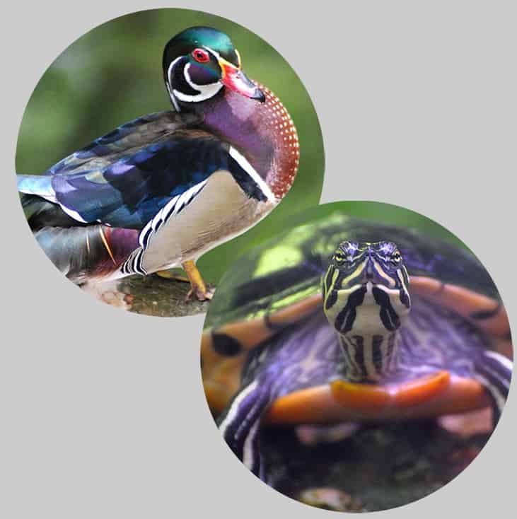 Further along, I see sunning turtles; these turtles are yellow-bellied sliders, the sunlight highlighting yellow stripes on the sides of their faces. The turtles are aligned upon trees that have fallen into the creek, creating perfect turtle perches. When the turtles are startled, they quickly slide off the trees into the water.