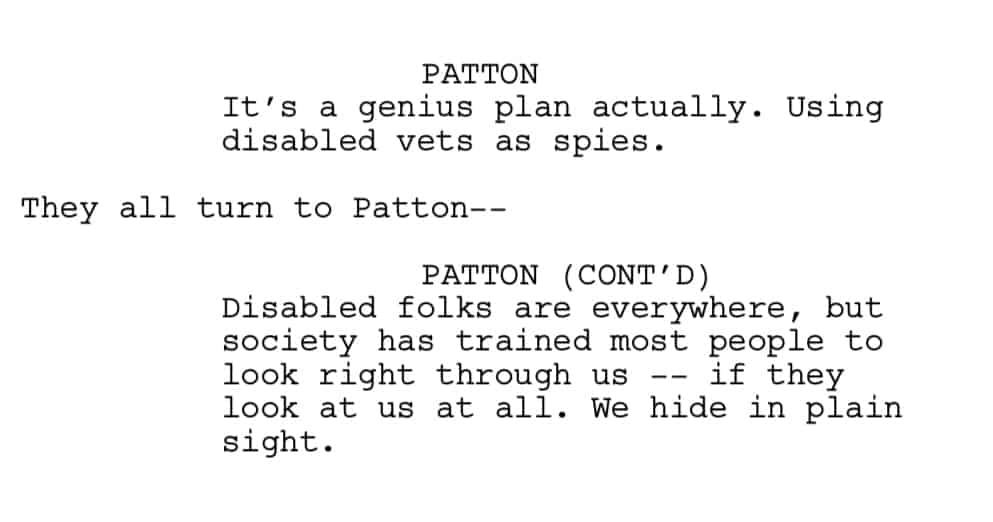 “The idea came from stories I shared with coworkers about how easy it is for me to sneak things into places,” shares Beattie, who has cerebral palsy. “Like bringing food into Disneyland or alcohol into a pricey music festival because security guards aren’t going to ask me to stand up to check my wheelchair cushion.” The other writers laughed and thought it was interesting, so they brainstormed how it could fit into a military story. “Because Patton is a tech guy, we thought it would be cool to put those two worlds together,” says Beattie.