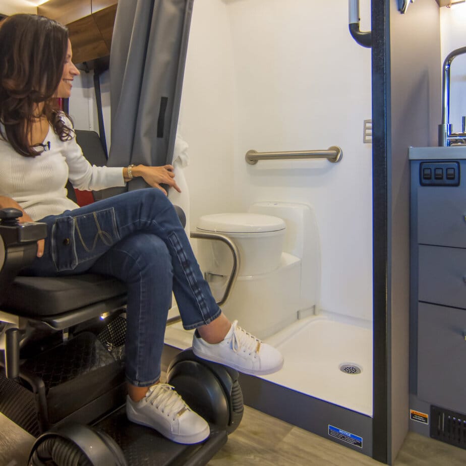 Right next to the galley is the toilet and shower compartment. There is a 3.5-inch step up to the toilet, with a removable waste tank that detaches like a cassette. The toilet has two grab bars and rotates 90° for easier showering while seated. The shower compartment has a handheld showerhead with hot and cold water, and a magnetic enclosure to prevent spillage. The bathroom may be the most challenging feature of the Roam because it requires that extra step up to the toilet. A strong manual wheelchair user might be able to make the lateral transfer, but it would be tricky.