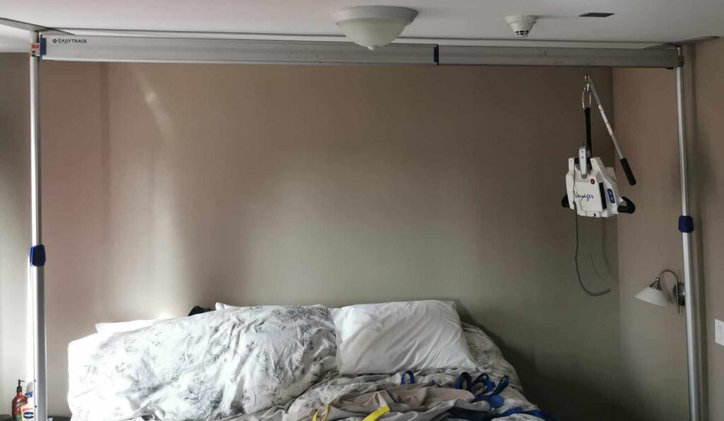 The queen-size bed looked fine — maybe a tad crowded with our Great Dane dogpiling in, but it would work. To make sure I’d be comfortable, we brought a ROHO mattress overlay. But when we placed it down, we didn’t like that my side of the bed was 3 inches higher than Terry’s. We purchased a queen-size memory foam and cut out a hole to fit the ROHO, making both sides of the bed an equal height. I like to sleep in a reclined position, so we brought a memory-foam bed-wedge-pillow set. It lets me relax as I’m used to, and I was as comfy as in our recliner-bed at home. To transfer me to bed, we brought along an Arjo EasyTrack Free Standing portable rail system. It’s easy to carry and set up and we found it online for a good price. Dave and Terry had it ready in minutes.