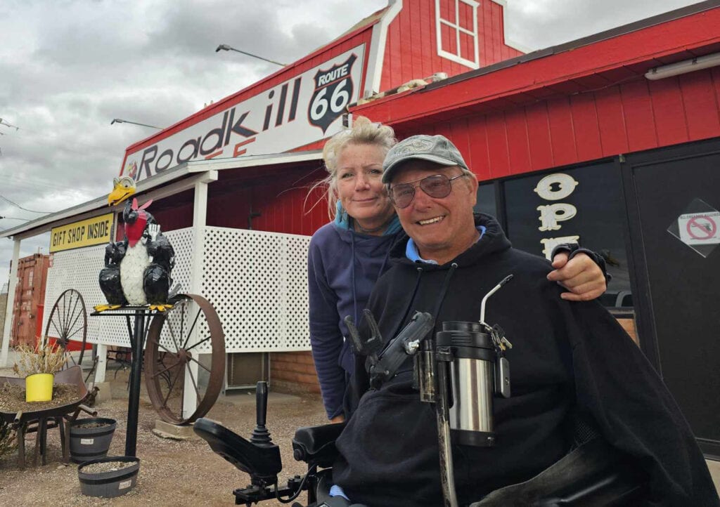 Next up was the bathroom. My commode chair fit fine, but the shower looked tough to manage. The existing enclosure had an 8-inch lip and there wasn’t a lot of room for a ramp. Fortunately, our friends Joe and Sue showed up to camp on-site. Joe happens to be great at carpentry and fabrication, knows my needs, and was happy to problem-solve the tub/shower. “I’ll build an insert so your commode wheels don’t drop down into the shower pan,” said Joe. “It’d be hard to get you back out.”