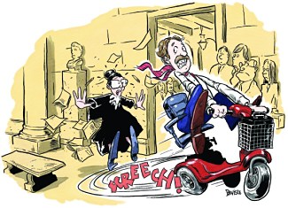 When the arguments ended, I returned to my scooter. I had trouble turning the scooter around to leave because I wasn’t familiar with the controls and people were streaming into the narrow space on the way to some meeting in the lounge. When I finally got the scooter turned around and began maneuvering around people, I saw a break in the traffic and sped up to get out the door before the next group of people came in. Just then, the diminutive Justice Ginsburg popped up. I stopped as quickly as I could, and as she stepped back in surprise, I said with as much apologetic good cheer as I could muster, “Oh! Excuse me, Justice Ginsburg!” She smiled at me and patted me on the shoulder as she entered the lounge. I was relieved that my career would not end with the headline “Disabled Attorney Assaults Justice with Scooter.”