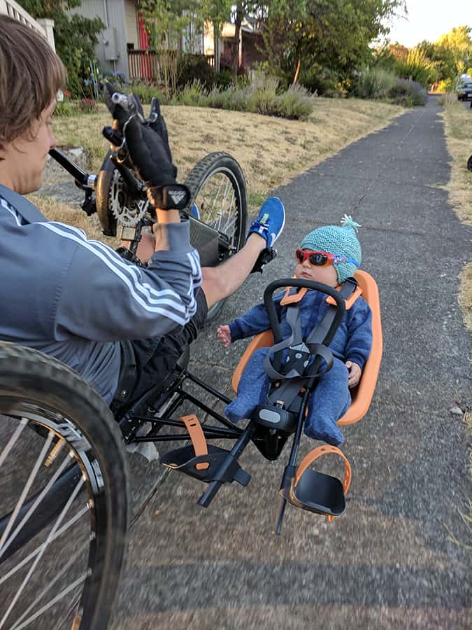 The first solution was an adaptation for my handcycle that Kelly’s dad rigged up while we were visiting in Ohio. We’d bought a Thule Yepp Mini front bike seat off Craigslist, but at 3 months, Ewan wasn’t yet stable enough to sit upright in it. Her dad fabricated a rack that clamped on the frame of my Top End Force CC handcycle. The Yepp seat then clamped onto that rack at a more reclined angle than it would on a regular bike. Ewan could lie in the seat, strapped in and secure while I rode him around.