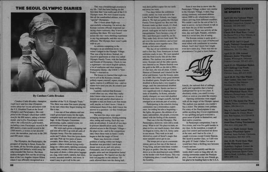 For our first issue, Candace Cable (then Candace Cable-Brookes) documented her adventures in Seoul, South Korea, attending the Olympics and competing in the Paralympics in 1988. She ended up taking home five gold medals and a bronze, setting a new Paralympic record in the 800-meters and a new world record in the 1500-meters, but what struck us was her astute social commentary on the impact the Paralympics had on Korean culture. “People had told us the disabled in Korea had a very negative image, until the international disabled athletes came there,” says Cable. “Sports can have a very significant role in shaping perceptions of disability. In Korea, attitudes totally changed. We were told disabled Koreans were no longer castoffs but had emerged as an intricate part of society.”