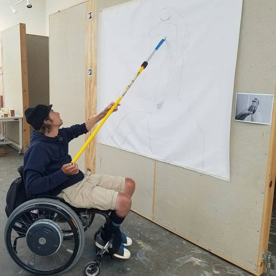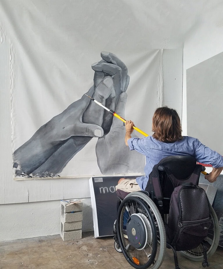 For his 2019 installation, My Mother’s Hands, David McCauley drew inspiration from Reveca Torres’s 2018 “Quad Hands” column in New Mobility. The installation features two large canvas paintings of McCauley’s mother’s hands holding his own paralyzed hands. “My mom is a classically trained painter, but I didn’t come to painting until art therapy, after I was paralyzed. Art was a beautiful way to calm the mind and process the emotions after I was injured,” he says. “These paintings are symbolic of all the things that I can accomplish in life with just a little bit of help.”