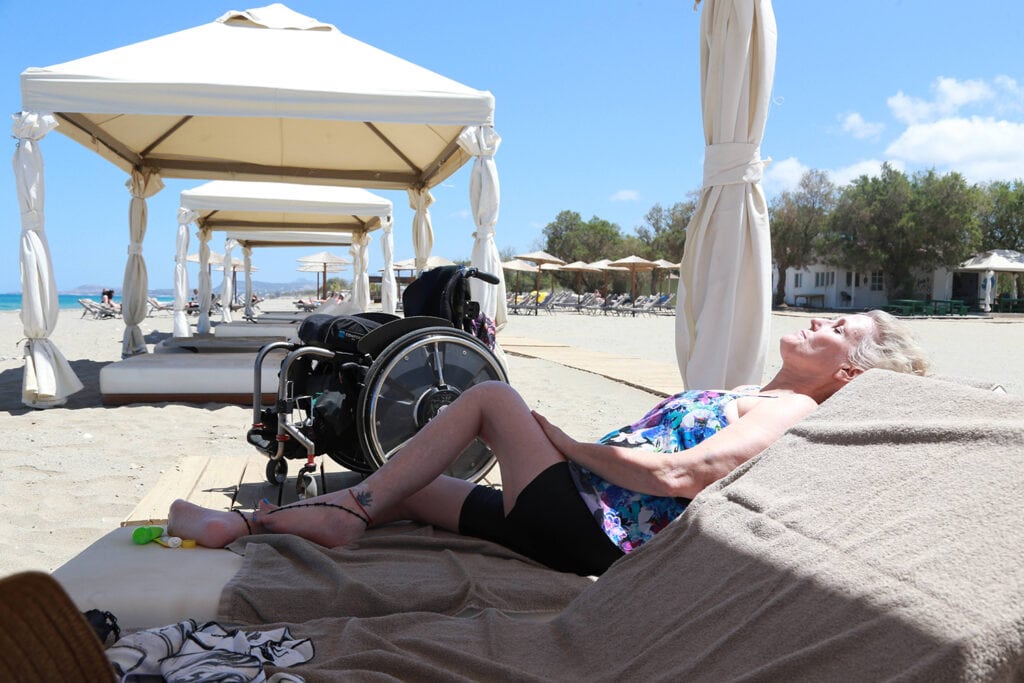 For our time in Crete, we stayed at Grecotel Creta Palace on the north-facing beach in Rethymno. The resort’s integrated ramps and amenities ensured a barrier-free stay. My room was thoughtfully arranged with Greek pastries, champagne, and a birthday cake to honor my milestone. Lounging under beach cabanas, we sipped cocktails and let the sand slip through our fingers. We meandered through the hotel’s lush gardens, explored the shops, and enjoyed various amenities. The hotel, already notable for its inclusive features like accessible beach pathways and navigable grounds, is set to enhance its facilities further with upcoming winter renovations, promising even greater accessibility.