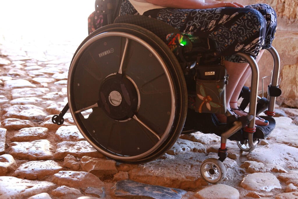 My Yamaha Navi One power assist made navigating Athens’ mostly accessible curb cuts manageable but figuring out public transportation in Athens on the fly proved tricky. I discovered that many taxis in Athens are station wagons capable of holding a manual wheelchair without disassembly, and the drivers we met were friendly and helpful. Later, I found out that the entire public transport network is also wheelchair accessible and less spendy.