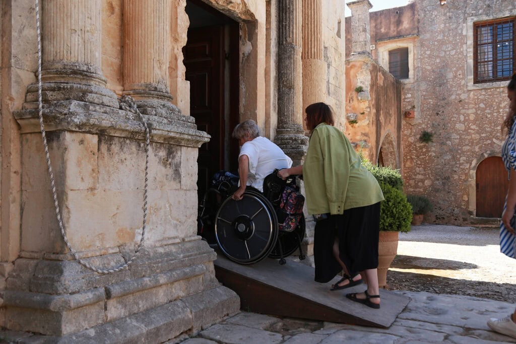 A makeshift wheelchair ramp at Arkadi Monastery is a modern symbol of independence, echoing the site’s historic resilience during Greece’s fight for freedom.