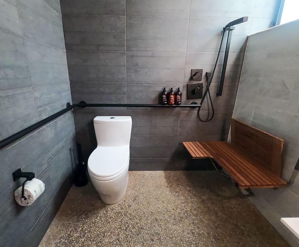 AutoCamp has made these bathrooms accessible and luxurious, equipped with a roll-up sink and a lovely roll-in shower. The shower bench is mounted with adjacent grab bars — not pressing into one’s back —and the hand-held shower nozzle is within reach. This shower setup alone is a reason to go glamping.