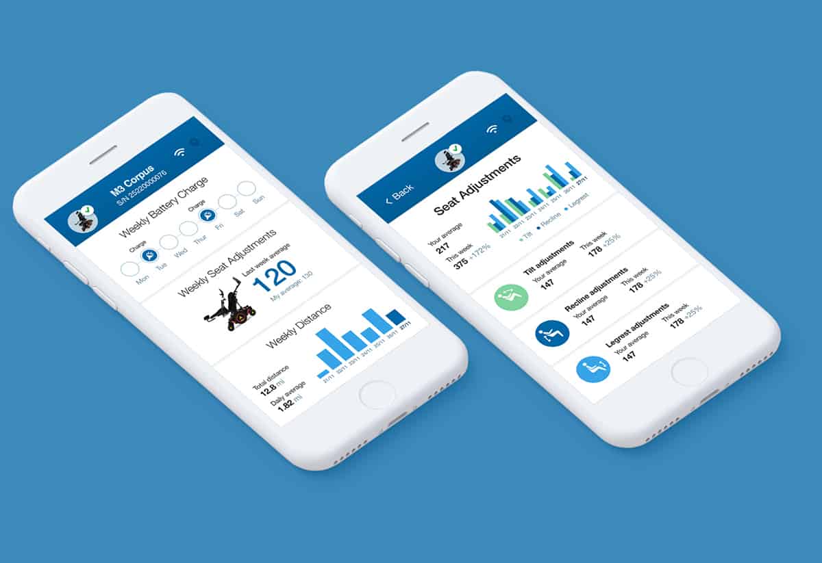 Permobil launched its predictive maintenance technology, Permobil Connect, in December 2017 and it now comes standard on all Corpus model chairs. The system has a Connect module that uploads chair information to the web via an AT&T Global SIM card. Dealers access the information via a portal, with chairs needing attention showing at the top of the list. Permobil users can log into the My Permobil app on their smartphone to view graphs that show battery charge status, seat function usage summaries, mileage, and any error codes, which also send an automatic alert to their dealer.